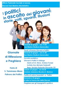 Venerdì 22 giugno, in occasione della festa di San Tommaso Moro, patrono dei politici, si terrà presso il San Marino Stadium di Serravalle un incontro sul tema: "I politici in ascolto dei giovani: storie, volti, sguardi, illusioni". Ai tavoli di lavoro tra giovani e politici alle ore 19, seguirà un…