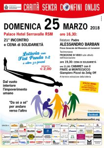Domenica 25 marzo dalle ore 16:30 si tiene il 21° Incontro e cena di solidarietà organizzato da Carità senza Confini, Relatore padre Alessandro Barban, Priore Generale del Monastero di Camaldoli…
