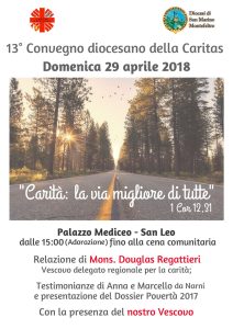 Domenica 29 aprile dalle ore 15 presso il Palazzo Mediceo di San Leo si terrà il 13° Convegno diocesano della Caritas sul tema: "Carità: la via migliore di tutte". Relatore: S.E. Mons. Douglas Regattieri…