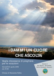 Domenica 22 aprile, “Domenica del Buon Pastore”, si celebra in tutta la Chiesa la Giornata Mondiale di preghiera per le vocazioni. Il Centro Diocesano Vocazioni organizza una Veglia diocesana per venerdì 20 aprile alle ore 21 presso la chiesa parrocchiale di Macerata Feltria (PU). Si coglie l’occasione per informare anche…