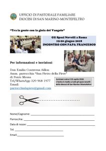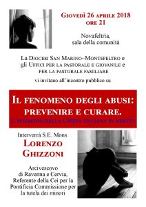 Giovedì 26 aprile ore 21 a Novafeltria si terrà un incontro pubblico sul tema: "Il fenomeno degli abusi: prevenire e curare. L'iniziativa della Chiesa italiana in merito". Relatore: S.E. Mons. Lorenzo Ghizzoni, Referente della CEI per la Pontificia Commissione per la tutela dei minori…