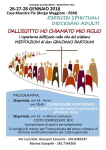 26-27-28 gennaio 2018 presso la Casa delle Maestre Pie di Borgo Maggiore si terranno gli Esercizi Spirituali per gli adulti (organizzati dall'Azione Cattolica). Meditazioni del diacono Graziano Bartolini, assistente spirituale dell'AC Adulti…