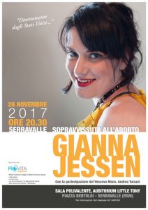 Domenica 26 novembre alle ore 20:30 presso la Sala Polivalente di Serravalle (piazza Bertoldi) incontro con Gianna Jessen, la donna statunitense sopravvissuta ad un aborto salino…