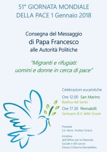 1 gennaio 2018 GIORNATA DELLA PACE. Il testo del Messaggio del Santo Padre verrà consegnato alle autorità durante la solenne liturgia *alle ore 12:00 nella Basilica del Santo in Città (RSM) e * alle ore 17:30 a Pennabilli nel Santuario della B.V. Grazie. Presiede S.E. Mons. Andrea Turazzi…