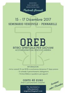 Dal 15 al 17 dicembre presso il Seminario di Pennabilli si terrà un ritiro spirituale per giovani dal titolo: "Oreb". Le meditazioni saranno tenute dal Vescovo Andrea. Iscrizioni entro il 1 dicembre…