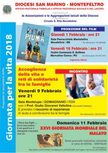 INIZIATIVE PER LA GIORNATA DELLA VITA: CINEFORUM giovedì 1 febbraio ore 21 a Novafeltria e venerdì 16 febbraio ore 21 a Mercatino Conca; CONFERENZA venerdì 9 febbraio ore 21 a Domagnano (RSM); GIORNATA MONDIALE DEL MALATO domenica 11 febbraio…