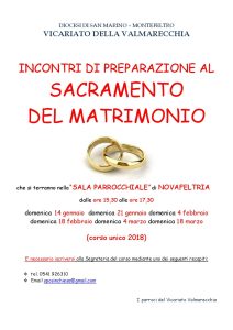 A partire da domenica 14 gennaio si terrà il corso unico 2018 di incontri in preparazione al sacramento del Matrimonio per il Vicariato Val Marecchia. Gli incontri si svolgeranno a Novafeltria nella Sala parrocchiale…