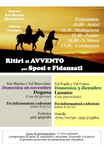 Domenica 26 novembre a Dogana (per i vicariati Val Marecchia e San Marino) e domenica 3 dicembre a Lunano (per il vicariato Val Foglia/Val Conca) dalle ore 10 alle 17 si terrà il ritiro di Avvento per sposi e fidanzati…