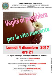 Lunedì 4 dicembre ore 21 in contemporanea nelle tre sedi di Novafeltria (chiesa parrocchiale), Monte Cerignone (santuario B. Domenico), Montegiardino (chiesa parrocchiale) si terrà la veglia di preghiera per la vita nascente…