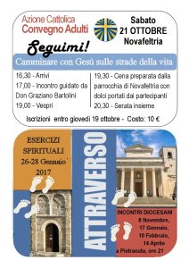 Sabato 21 ottobre dalle ore 16:30 a Novafeltria si terrà il convegno degli adulti di Azione Cattolica: "Seguimi. Camminare con Gesù sulle strade della vita". Relatore: diacono Graziano Bartolini. A seguire Vespro e serata insieme…