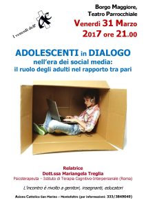 Venerdì 31 marzo ore 21 presso il teatro parrocchiale di Borgo Maggiore (RSM) si terrà l'incontro del ciclo "I Venerdì dell'AC" sul tema: "Adolescenti in dialogo sul tema dei social media: il ruolo degli adulti nel rapporto tra pari. Relatrice: dott.ssa Mariangela Treglia, psicoterapeuta…