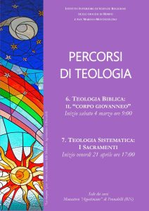 Da sabato 4 marzo presso il monastero delle Agostiniane di Pennabilli inizierà il corso di Teologia biblica: "Il corpo giovanneo" con il prof. don Carlo Rusconi e da venerdì 21 aprile il corso di Teologia sistematica: "I Sacramenti" con il prof. don Marco Casadei. Clic per info…