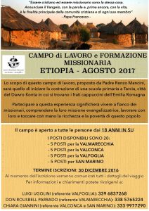 Sono aperte le iscrizioni al campo di lavoro e di formazione missionaria in Etiopia in agosto 2017. Termine iscrizioni 30 dicembre 2016…