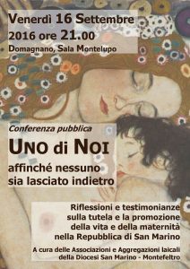 Venerdì 16 settembre alle ore 21 presso la Sala "Montelupo" di Domagnano si terrà una Conferenza pubblica sul tema della promozione della vita nella Repubblica di San Marino a cura delle aggregazioni laicali della diocesi…