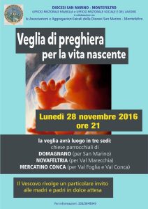 Lunedì 28 novembre alle ore 21 si terrà la veglia di preghiera per la vita nascente in tre sedi: Domagnano, Novafeltria e Mercatino Conca.