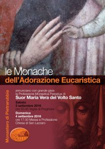 Domenica 4 settembre alle ore 17 presso la chiesa di San Lazzaro di Ponte Cappuccini il Vescovo Andrea Turazzi presiederà la Professione Monastica Perpetua di Suor Maria Vera del Volto Santo…