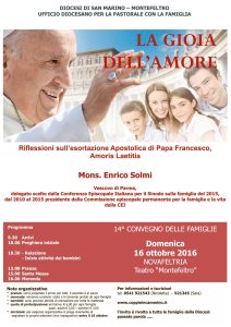 Domenica 16 ottobre si terrà a Novafeltria presso il Teatro "Montefeltro" il Convegno diocesano delle famiglie. Tema: la gioia dell'amore. Riflessioni su Amoris Laetitia. Relatore S.E. Mons. Enrico Solmi…