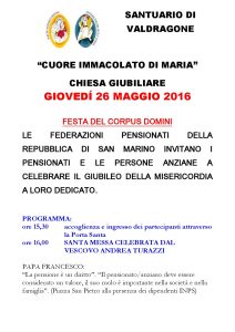 Giovedì 26 maggio alle ore 15.30 presso il Santuario di Valdragone (RSM) le federazioni pensionati della Repubblica di San Marino invitano i pensionati e le persone anziane a celebrare IL GIUBILEO DELLA MISERICORDIA a loro dedicato…