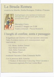 LA STRADA ROMEA: crocevia tra Marche, Emilia Romagna, Umbria e Toscana. Il pellegrinaggio come esperienza di misericordia: dai luoghi fisici agli spazi dello spirito che hanno generato Santi e Beati. PRIMO INCONTRO VENERDI' 27 MAGGIO ORE 21 A MERCATINO CONCA (piazza Rossini 8). Interventi di S.E. Mons. Andrea Turazzi, Suor…