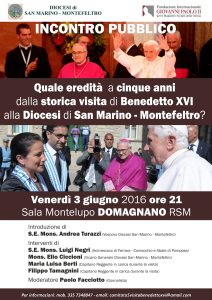 La Diocesi di San Marino-Montefeltro, a “cinque anni” dalla visita di Benedetto XVI alla Diocesi, desidera offrire alcune occasioni per far memoria di quell’avvenimento storico a partire da VENERDì 3 GIUGNO ORE 21…