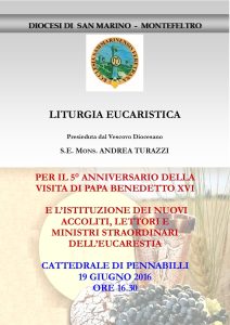 Domenica 19 giugno ore 16:30 presso la Cattedrale di Pennabilli si terrà la celebrazione eucaristica con l'istituzione dei nuovi ministri: lettori, accoliti, ministri straordinari dell'Eucaristia. Si celebrerà anche il 5°anniversario della venuta di papa Benedetto XVI nella diocesi di San Marino-Montefeltro…
