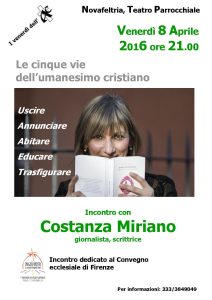 I Venerdì dell'AC: ore 21 presso il Teatro parrocchiale di Novafeltria incontro con la giornalista e scrittrice Costanza Miriano. Tema: Le cinque vie per un nuovo umanesimo…