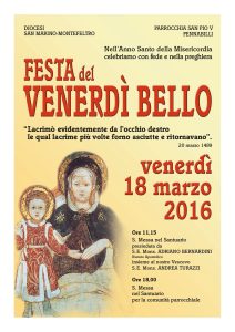 Venerdì 18 marzo a Pennabilli si terrà la festa del "Venerdì Bello" in ricordo della lacrimazione della Beata Vergine nella chiesa di Sant'Agostino (Santuario B.V. delle Grazie). S.Messa ore 11.