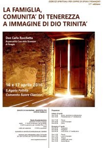 Sabato 16 e domenica 17 aprile si terrà un ritiro per le coppie di sposi e di fidanzati presso le Clarisse di Sant'Agata Feltria. Relatore don Carlo Rocchetta, responsabile Casa della Tenerezza di Perugia…