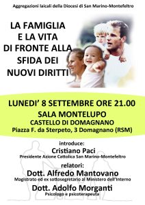 Ciclo degli incontri che si terranno presso il teatro parrocchiale “Don Sergio Sisto Severi” dalle ore 21.00 alle ore 23.00 ca. 15/09/2014 – La questione antropologica oggi. Genere, famiglia e società. Saluto introduttivo di S.E. Mons. Andrea Turazzi - Vescovo della Diocesi San Marino – Montefeltro. Avv. Luca Iannaccone – Ricercatore…