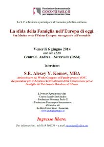 S.E. Alexey Y. Komov, MBA Ambasciatore del World Congress of Families* presso le Nazioni Unite (vedi sotto). Responsabile per le Relazioni Internazionali della Commissione Patriarcale per la Famiglia della Chiesa Ortodossa Russa. Direttore Internazionale dei Programmi della Fondazione Caritativa “San Basilio il Grande” Mosca. Per aggiornamenti: …
