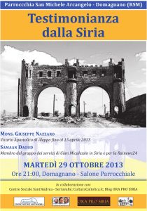Martedì 29 Ottobre 2013 Ore 21:00, Domagnano - Salone Parrocchiale Promosso dalla Parrocchia San Michele Arcangelo di Domagnano in collaborazione con Centro Sociale Sant'Andrea, Cultura Cattolica e Blog Ora pro Siria…