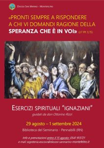 “Pronti sempre a rispondere a chi vi domandi ragione della speranza che è in voi” (cf. 1Pt 3,15) La Diocesi propone un corso di Esercizi Spirituali dal 29 agosto (con inizio ore 10) al 1° settembre (fino al pranzo compreso) presso la Biblioteca del Seminario vescovile di Pennabilli. È un’iniziativa…