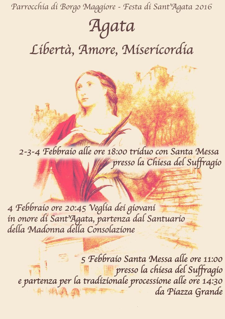 Borgo Maggiore: 2-3-4 febbraio ore 18 Triduo con S.Messa presso chiesa del Suffragio. 4 febbraio ore 20:45 Veglia dei giovani. 5 febbraio ore 14:30 processione