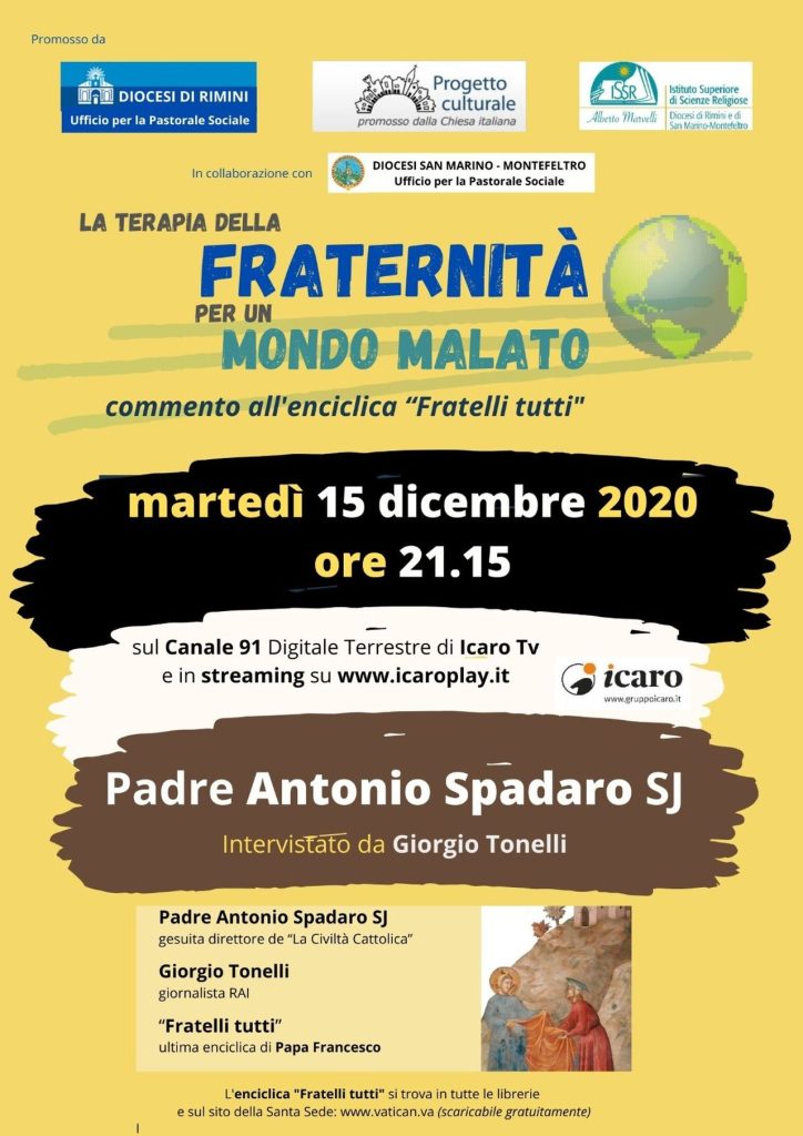 Martedì 15 dicembre alle ore 21.15 si terrà sul Canale 91 del Digitale Terrestre (ICARO TV) e in streaming su www.icaroplay.it un incontro di commento all'Enciclica di Papa Francesco "Fratelli tutti" con padre Antonio Spadaro sj: "La terapia della fraternità per un mondo malato". L'evento è promosso dall'ISSR "A.Marvelli" in collaborazione con l'Ufficio di Pastorale Sociale della Diocesi di San Marino-Montefeltro