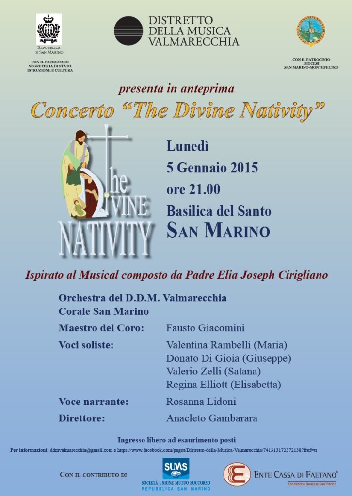 Confesso che quando sono arrivato nell’ antica Repubblica di San Marino, qualche anno fa, per servire nella parrocchia di Serravalle, sotto la guida di Don Peppino, non credevo che sarebbe stato possibile, lontano miglia e miglia da Broadway, completare questo lavoro: La Divina Natività. Ma la Divina Provvidenza non era tanto d’ accordo e ce lo dimostra questa sera.