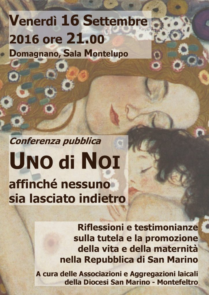 Venerdì 16 settembre alle ore 21 presso la Sala "Montelupo" di Domagnano si terrà una Conferenza pubblica sul tema della promozione della vita nella Repubblica di San Marino a cura delle aggregazioni laicali della diocesi