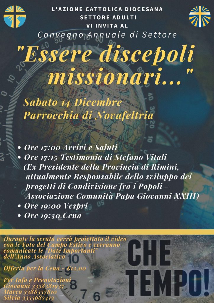 L'Azione Cattolica Diocesana Settore adulti invita tutti al Convegno annuale che si terrà sabato 14 dicembre a Novafeltria a partire dalle ore 17. Il tema sarà: "Essere discepoli missionari", con la testimonianza di Stefano Vitali dell'Associazione Papa Giovanni XXIII