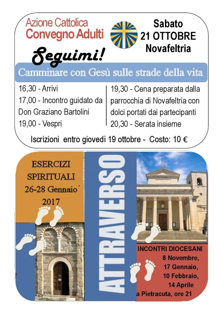Sabato 21 ottobre dalle ore 16:30 a Novafeltria si terrà il convegno degli adulti di Azione Cattolica: "Seguimi. Camminare con Gesù sulle strade della vita". Relatore: diacono Graziano Bartolini. A seguire Vespro e serata insieme