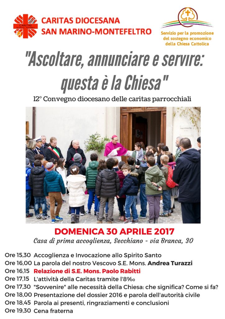 Domenica 30 aprile dalle ore 15:30 si terrà il XII Convegno diocesano delle Caritas parrocchiali presso la Casa di Prima Accoglienza di Secchiano. Tema: "Ascoltare, annunciare e servire: questa è la Chiesa". Relatore: S.E. Mons. Paolo Rabitti