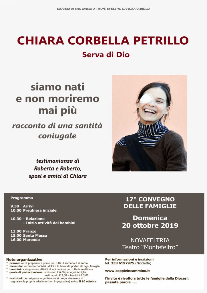 Domenica 20 ottobre dalle ore 9:30 presso il teatro "Montefeltro" di Novafeltria si terrà il 17° Convegno delle famiglie. Si ascolterà la testimonianza di una coppia di amici della Serva di Dio Chiara Corbella Petrillo: "Siamo nati e non moriremo mai più"