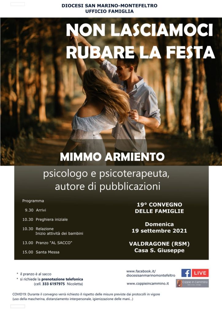 Domenica 19 settembre si terrà a Valdragone RSM (Casa San Giuseppe) il 19° Convegno delle Famiglie sul tema: "Non lasciamoci rubare la festa". Relatore: dott. Mimmo Armiento, psicologo e psicoterapeuta