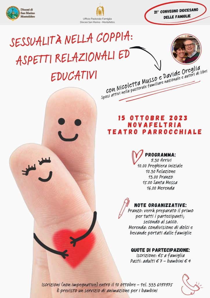 Domenica 15 ottobre dalle ore 9.30 presso il teatro parrocchiale di Novafeltria si terrà il 21° Convegno diocesano delle famiglie sul tema: “Sessualità nella coppia: aspetti relazionali ed educativi” con Nicoletta Russo e Davide Oreglia, sposi attivi nella pastorale familiare nazionale e autori di libri.