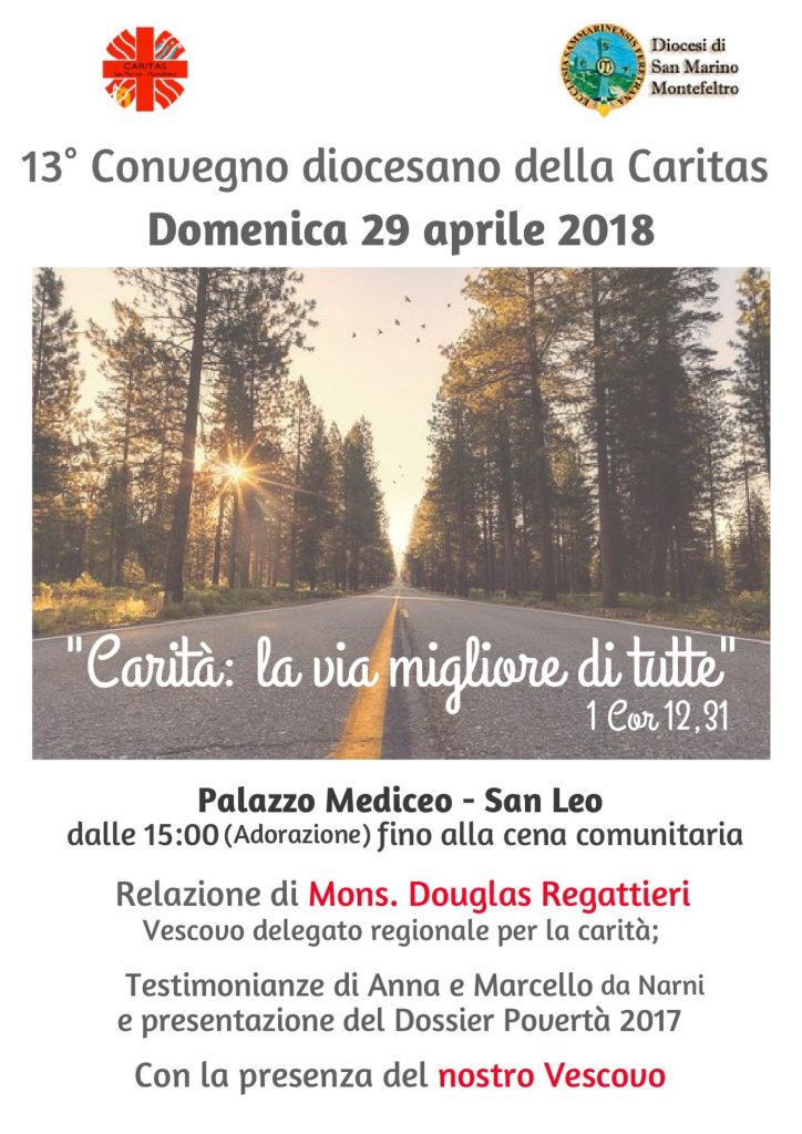 Domenica 29 aprile dalle ore 15 presso il Palazzo Mediceo di San Leo si terrà il 13° Convegno diocesano della Caritas sul tema: "Carità: la via migliore di tutte". Relatore: S.E. Mons. Douglas Regattieri