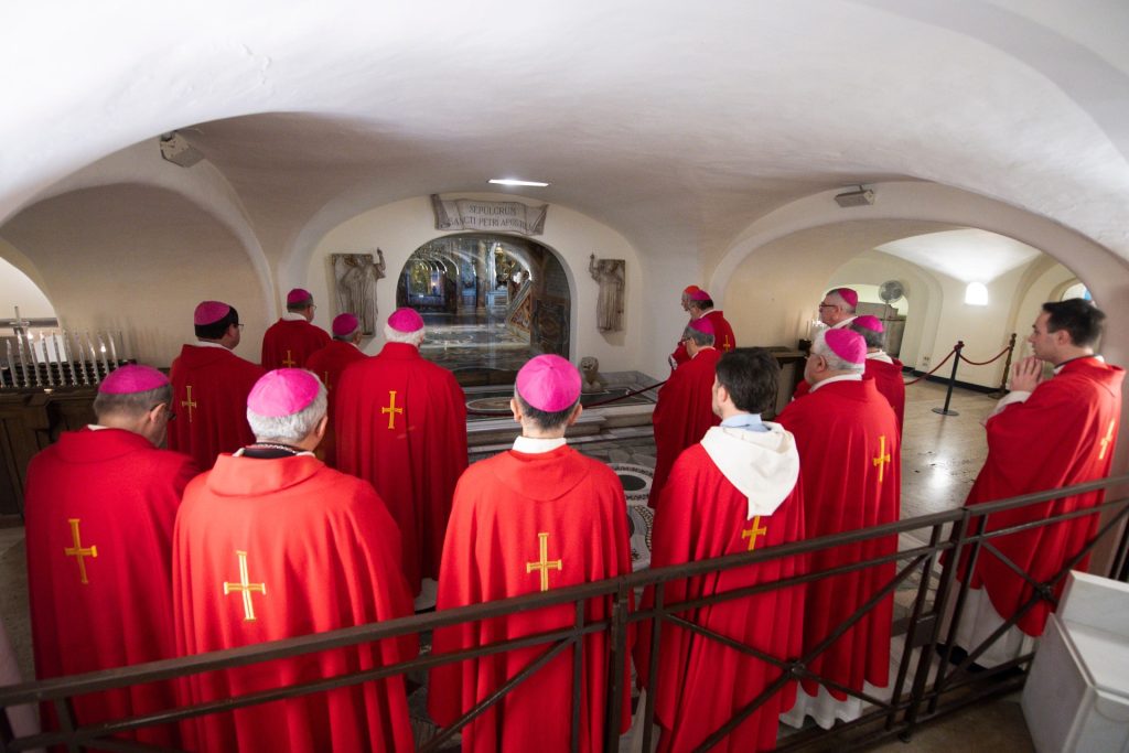 Facciamo sosta sulla tomba di due grandi pontefici: san Giovanni Paolo II e san Giovanni XXIII. Siamo avvolti dall’immensità e dalla bellezza di questo tempio. Il baldacchino sull’altare papale è in via di restauro; preferiamo allora scendere nelle grotte vaticane per la professione di fede sulla tomba di Pietro, colui al quale Gesù ha consegnato le chiavi: «Tu sei Pietro e su questa pietra edificherò la mia Chiesa…». È uno dei momenti qualificanti della Visita ad limina. Siamo venuti per questo momento intimo, comunitario e solenne.