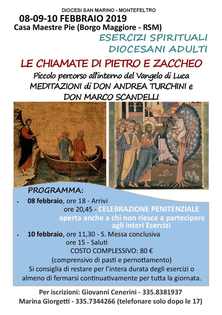Da venerdì 8 febbraio ore 18 a domenica 10 febbraio ore 15 si terranno gli Esercizi Spirituali per gli adulti organizzati dall'Azione Cattolica presso la Casa delle Suore Maestre Pie dell'Addolorata di Borgo Maggiore (RSM). Tema: "Le chiamate di Pietro e Zaccheo. Piccolo percorso all'interno del Vangelo di Luca". Meditazioni di don Andrea Turchini e don Marco Scandelli