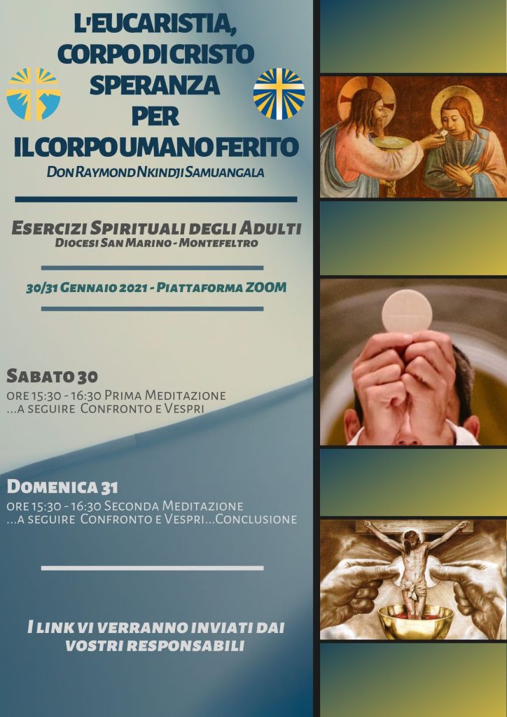 Sabato 30 e domenica 31 gennaio il Settore adulti dell'Azione Cattolica organizza un corso di Esercizi Spirituali per tutti gli adulti sul tema: "L'Eucaristia: corpo di Cristo, speranza per il corpo umano ferito". Le meditazioni saranno tenute da don Raymond Nkindji Samuangala
