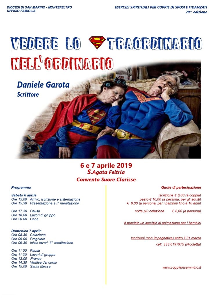 Sabato 6 e domenica 7 aprile l'UFFICIO FAMIGLIA DIOCESANO organizza a Sant'Agata Feltria presso il convento delle Clarisse gli ESERCIZI SPIRITUALI PER LE COPPIE DI SPOSI E FIDANZATI: "Vivere lo straordinario nell'ordinario". Relatore: Daniele Garota