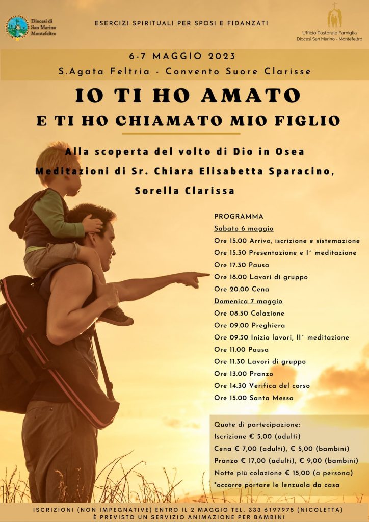 Sabato 6 e domenica 7 maggio, presso il Convento delle Clarisse di Sant'Agata Feltria, l'Ufficio Famiglia diocesano organizza una due giorni di Esercizi Spirituali per sposi e fidanzati sul tema: "Io ti ho amato e ti ho chiamato mio figlio. Alla scoperta del volto di Dio in Osea". Meditazioni di suor Chiara Elisabetta Sparacino