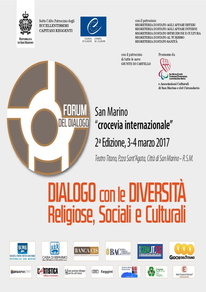 Venerdì 3 marzo e sabato 4 marzo si terrà a San Marino presso il Teatro Titano la II Edizione del Forum del dialogo dal titolo: "DIALOGO CON LE DIVERSITA' RELIGIOSE, SOCIALI E CULTURALI". Scarica il programma del Forum del dialogo.