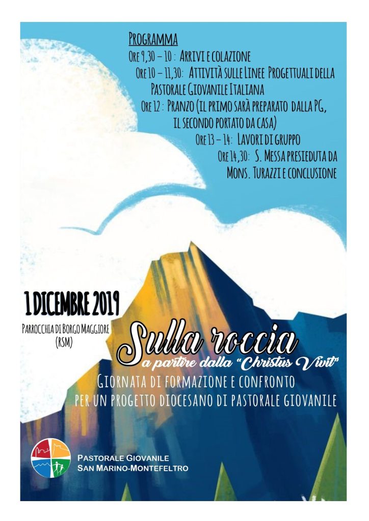 Domenica 1 dicembre a partire dalle ore 9:30 presso la parrocchia di Borgo Maggiore (RSM) si terrà una giornata di formazione e di confronto per un progetto diocesano di Pastorale Giovanile dal titolo: "Sulla roccia. A partire dalla Christus Vivit"